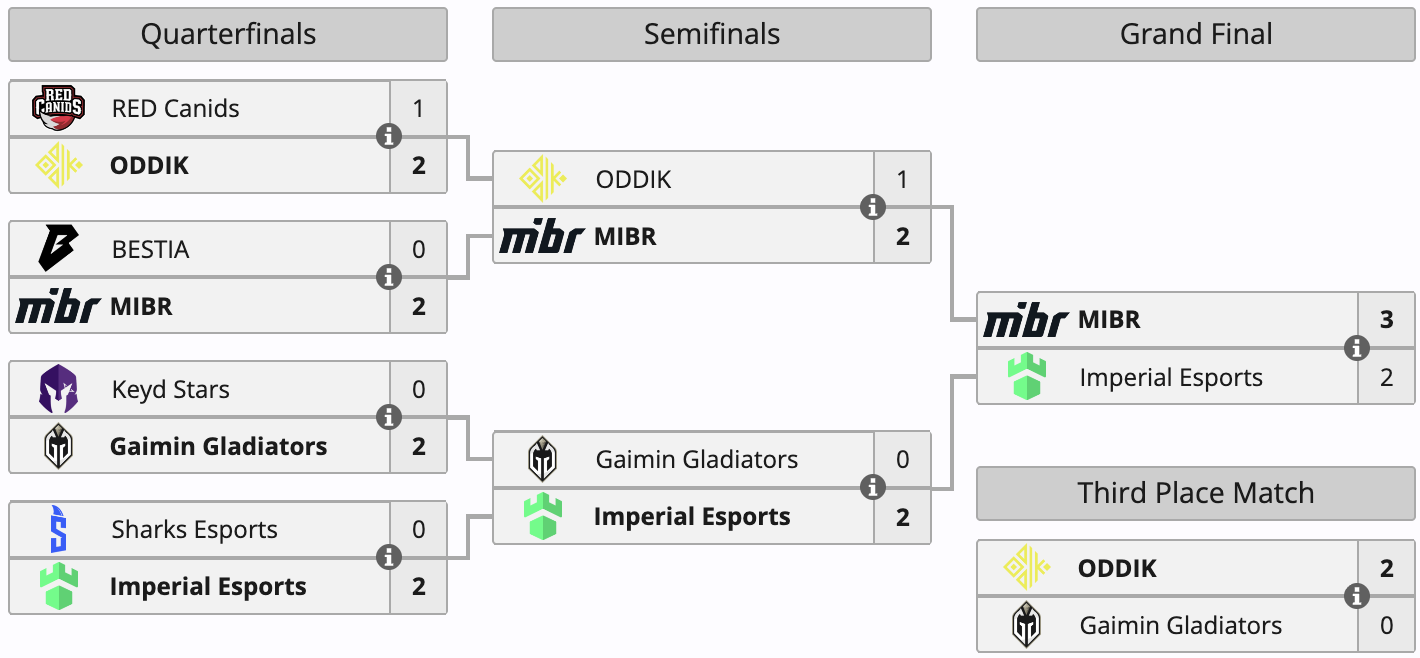 На пути в заключительный раунд турнирной сетки MIBR также расправилась с такими соперниками, как ODDIK и BESTIA.