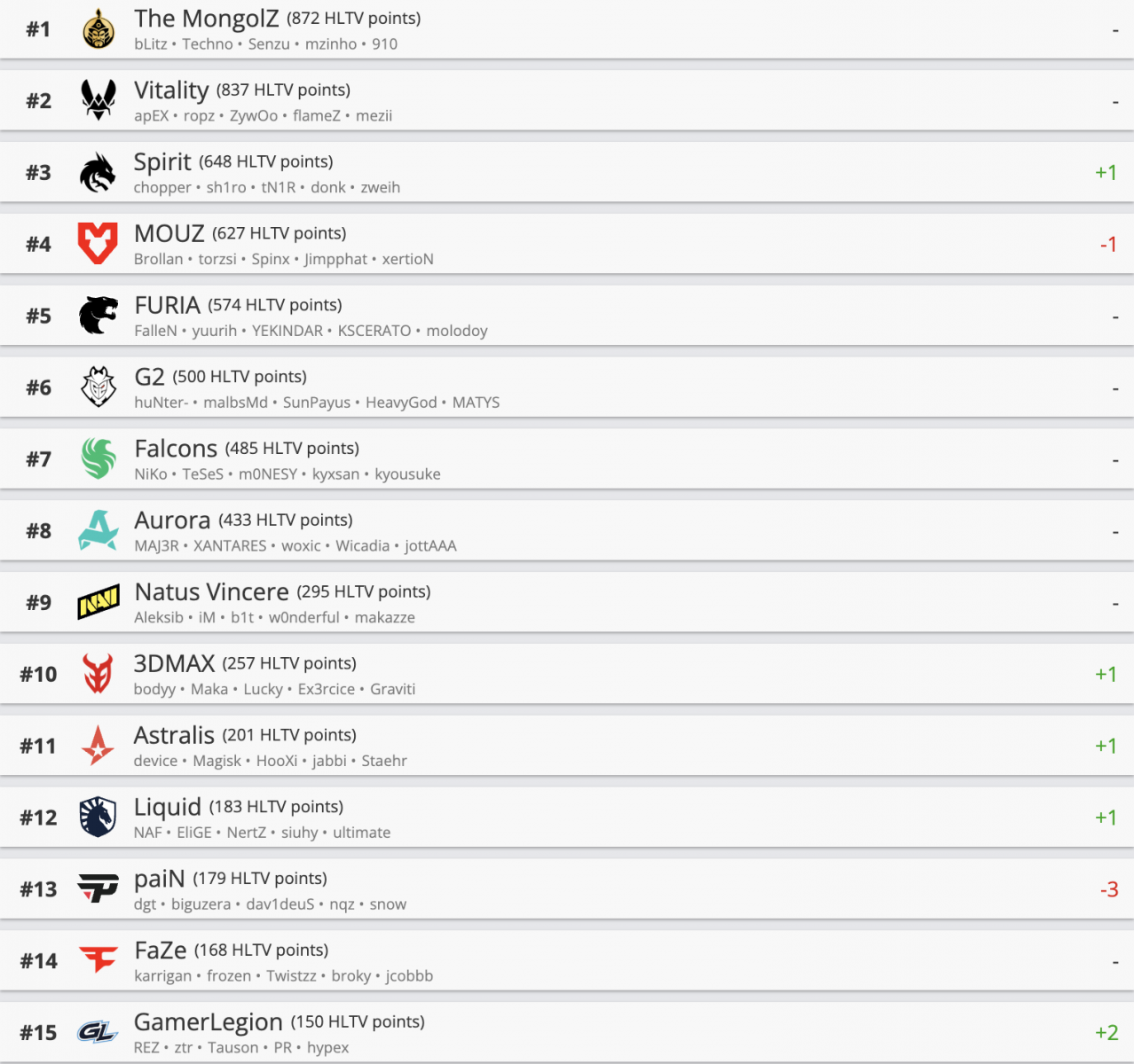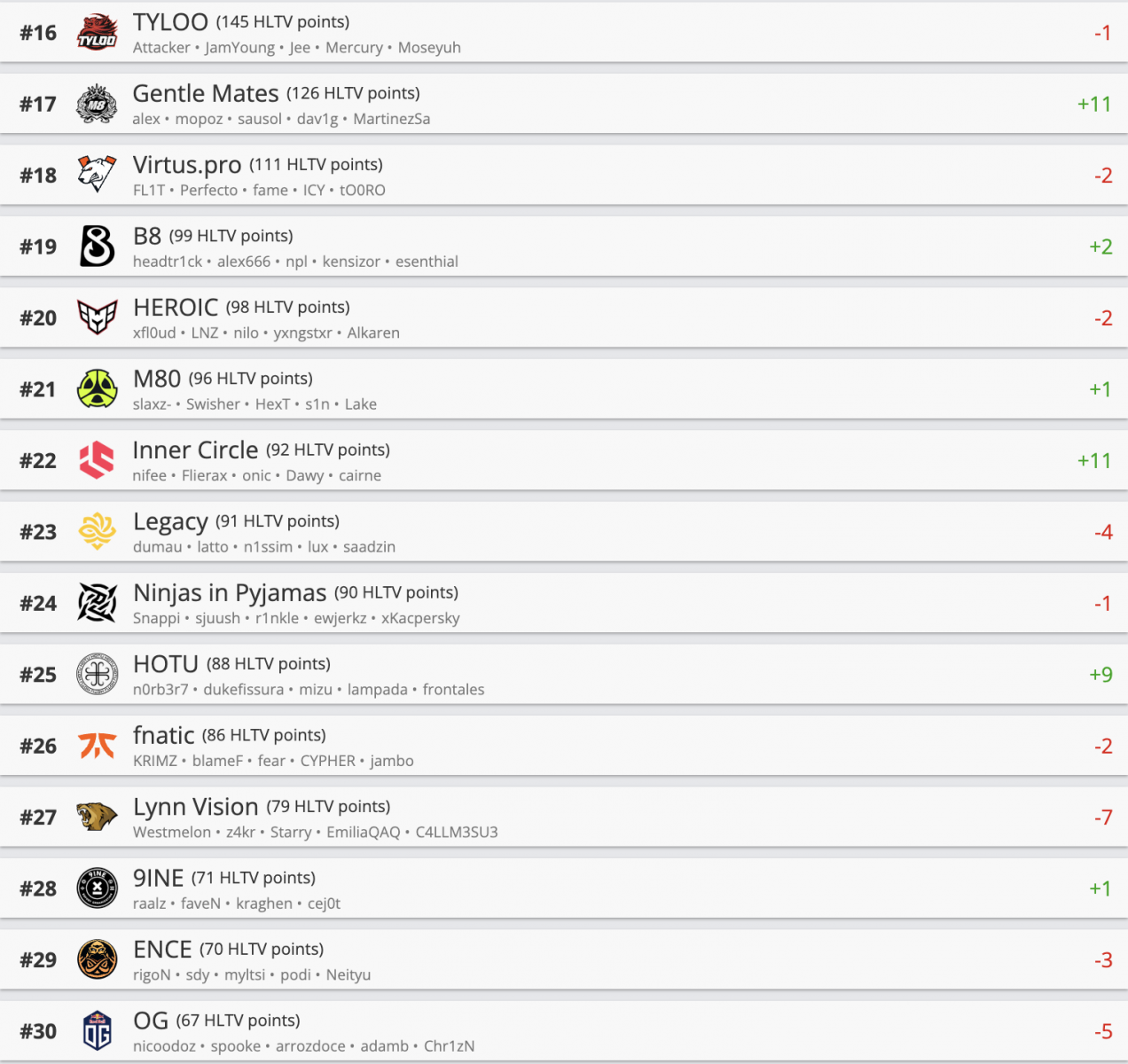 Astralis и Liquid поднялись на 11-е и 12-е места соотвествтенно, а paiN упала на 13-ю строчку. Состав Gentle Mates набрал сразу 11 пунктов в рейтинге и вошел в топ-17. Inner Circle поднялась на 22-е место, а HOTU – на 25-е.