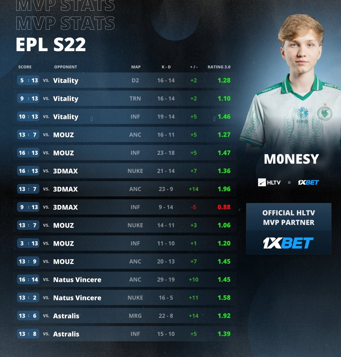 Средний рейтинг m0NESY за 15 карт составил 1.38. Наилучшего показателя Осипов добился на Ancient против 3DMAX (1.96), а худший результат показал на Inferno против 3DMAX (0.88).