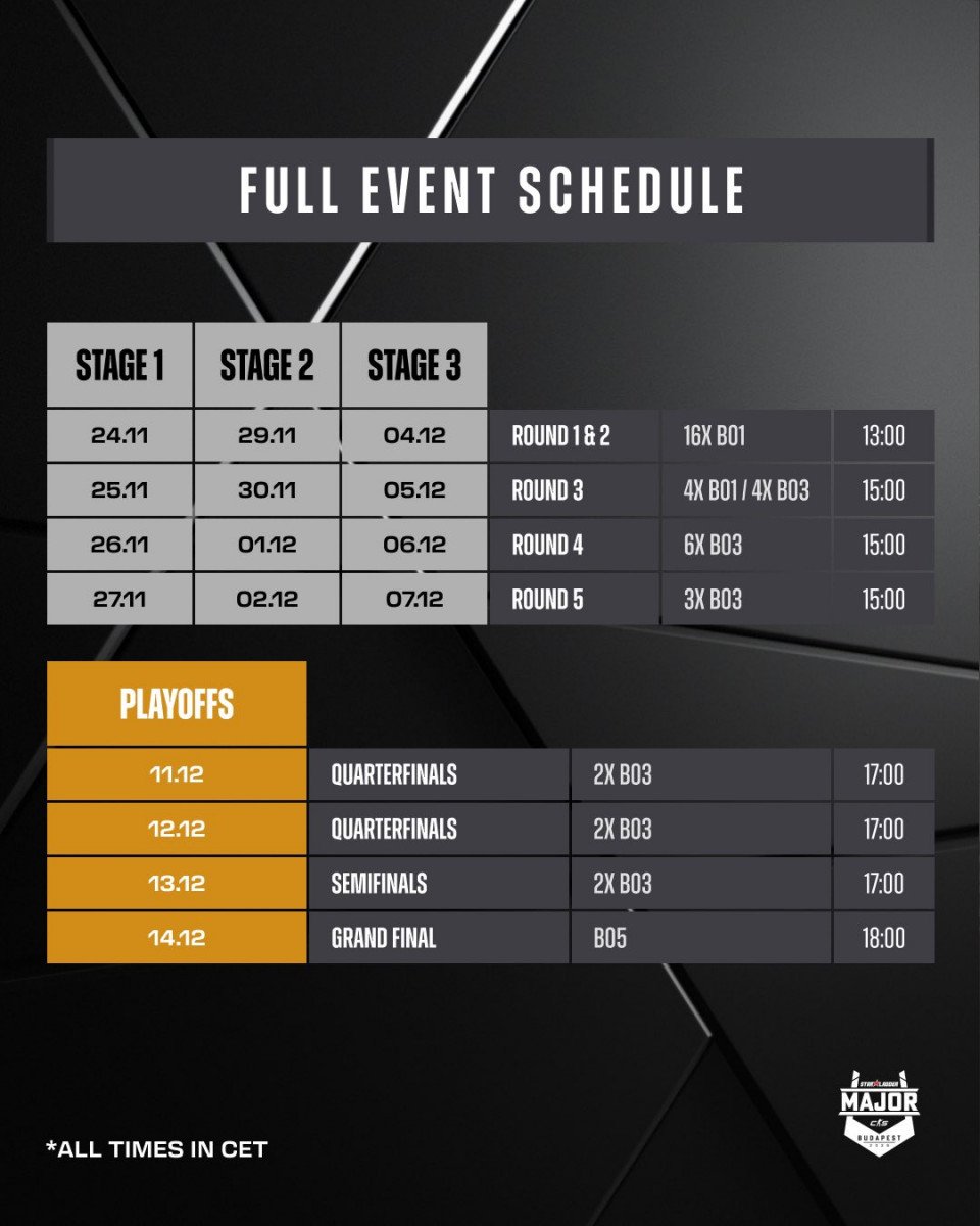 Турнирный оператор StarLadder представил расписание всех четырех стадий мейджора в Будапеште, которым завершится сезон 2025 года. Напомним, что турнир стартует 24 ноября – в первый день в борьбу вступят 16 коллективов, включая FaZe, Legacy, GamerLegion и др.