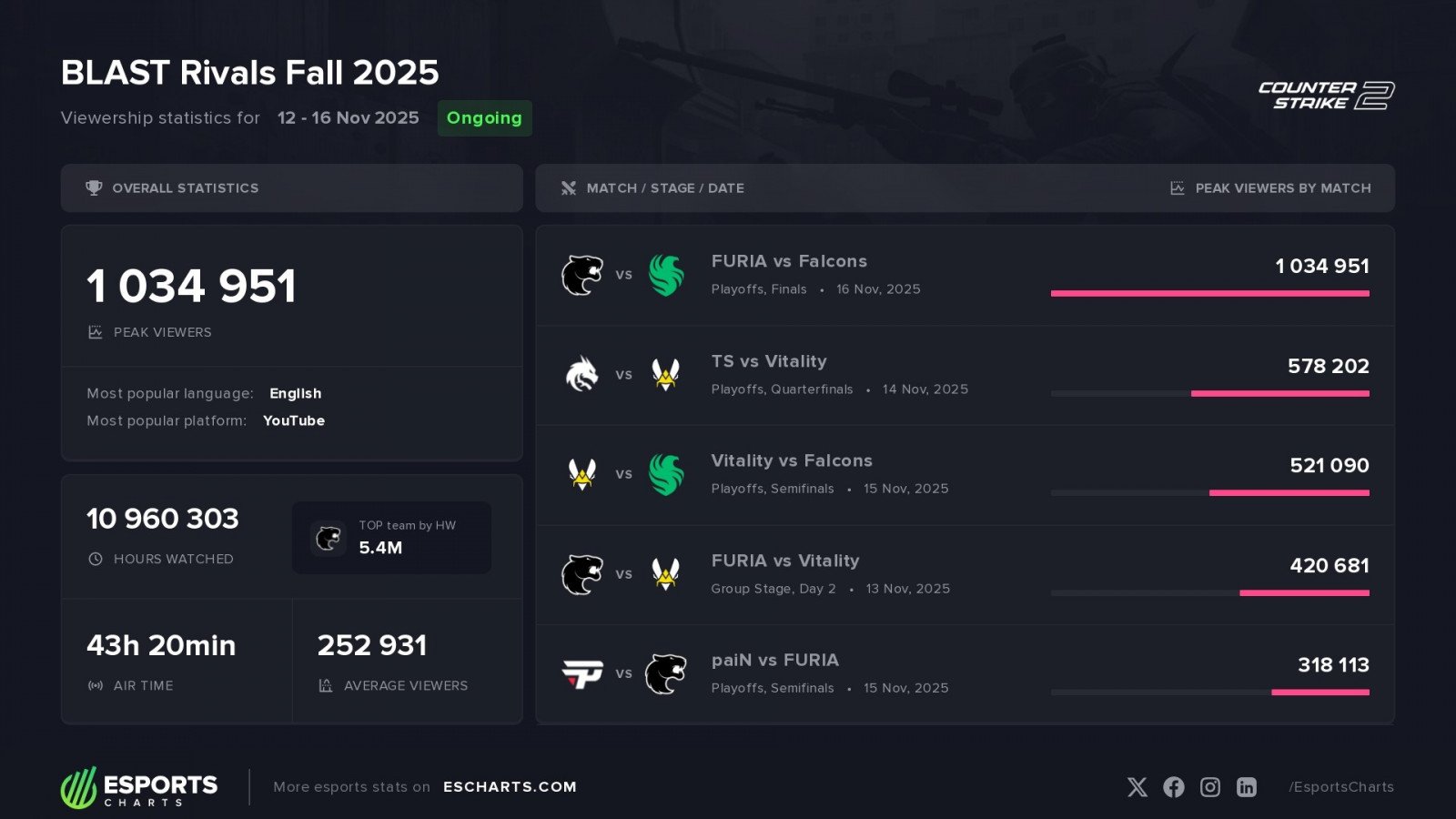 Минувший чемпионат BLAST Rivals 2025 Season 2, который завершился победой команды FURIA, собрал на трансляциях 1.03 млн зрителей в пике. Статистикой поделился аналитический сервис Esports Charts.