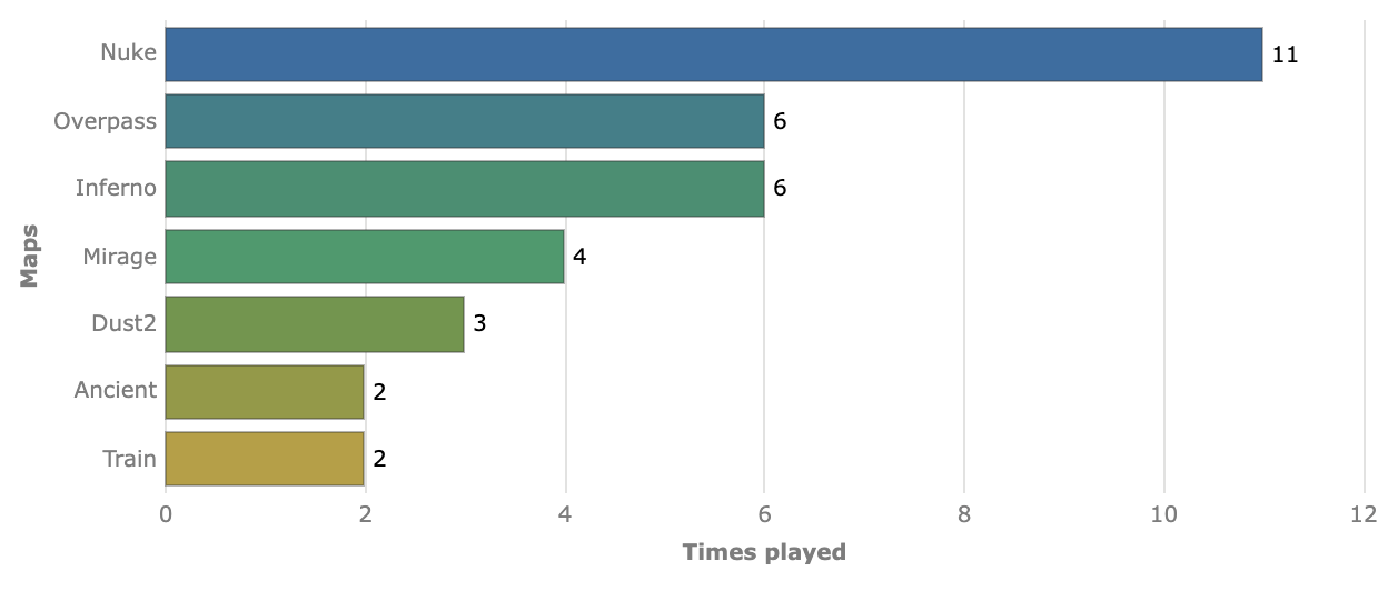 В топ-3 самых популярных карт ивента вошли Overpass и Inferno – команды провели на них по шесть игр. В первую пятерку также попали Mirage (4 игры) и Dust2 (3 игры).