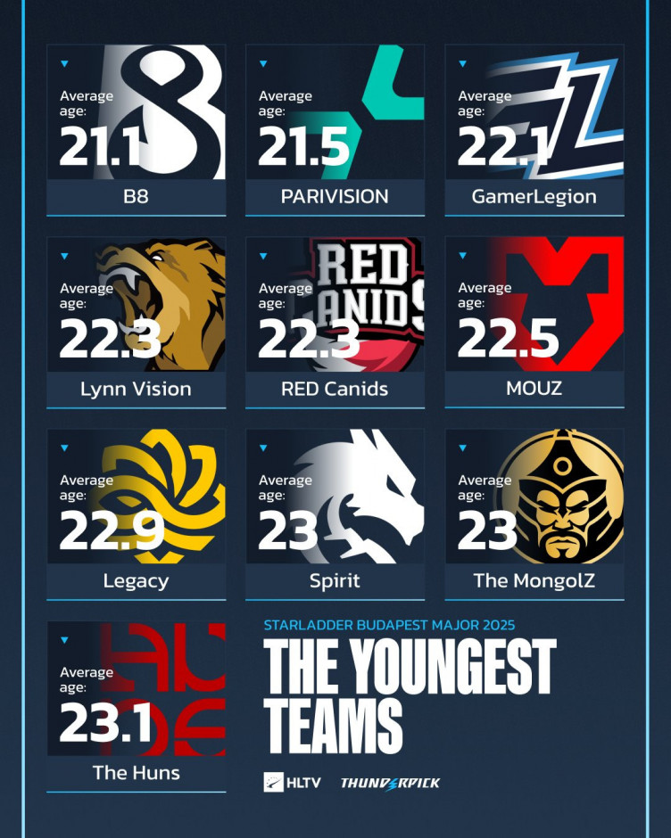 Самым молодым коллктивом на StarLadder Budapest Major 2025 стал B8 – средний возраст игроков украинской команды составляет 21.1 год. В первую тройку также входят PARIVISION (21.5) и GamerLegion (22.1). Статистикой поделился портал HLTV.org.