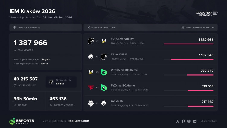 Минувший чемпионат IEM Kraków 2026, который завершился победой команды Vitality, собрал на трансляциях 1.38 млн зрителей в пике. Это самый высокий показатель вне мейджоров за всю историю Counter-Strike; IEM Kraków 2026 также стал самым популярным турниром в Польше. Статистикой поделился аналитический сервис Esports Charts.