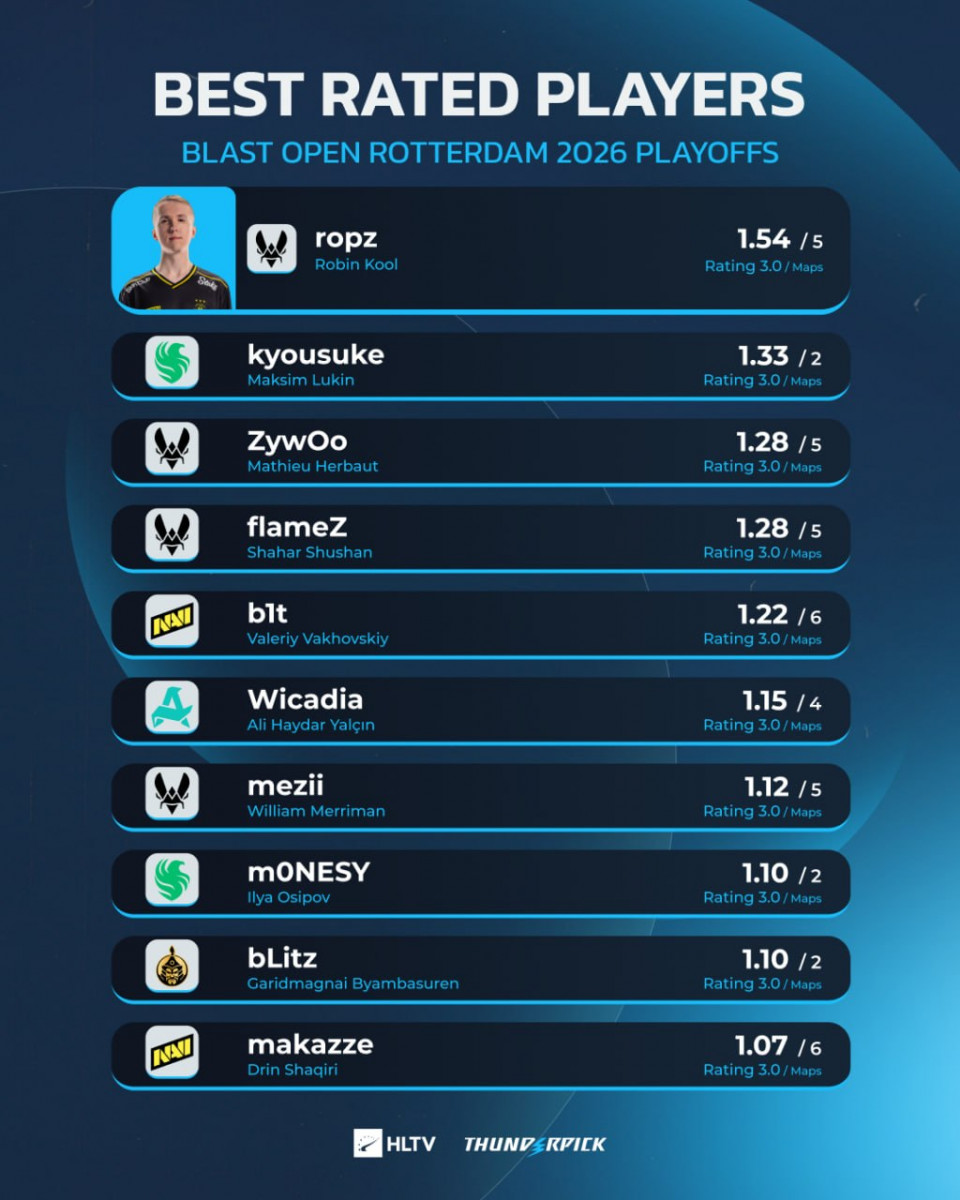 Участник коллектива Vitality Робин "ropz" Коль финишировал плей-офф BLAST Open Rotterdam 2026 по Counter-Strike 2 с самым высоким рейтингом среди всех участников соревнования – 1.54 за 5 карт.