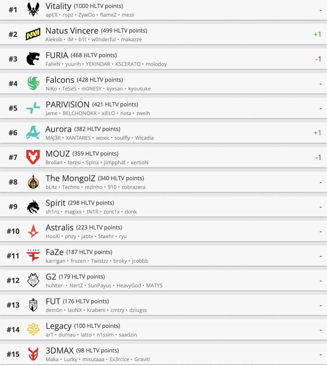Рейтинг от HLTV обновляется еженедельно и в первую очередь учитывает результаты за последние два месяца. В расчет также идут достижения команд за последний год, при этом количество очков за прошлые успехи уменьшается с каждым месяцем.
