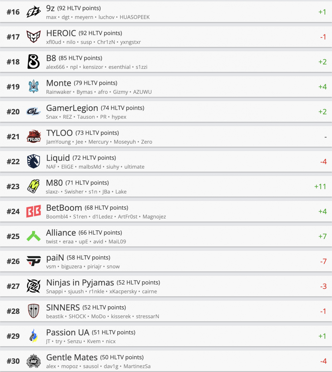 Кроме того, M80 набрала сразу 11 пунктов рейтинге после победы на DraculaN Season 6, а Alliance вошла в топ-25, поднявшись на семь позиций выше в таблице. Monte поднялась на четыре позиции выше, а Liquid, напротив, потеряла четыре пункта в рейтинге.