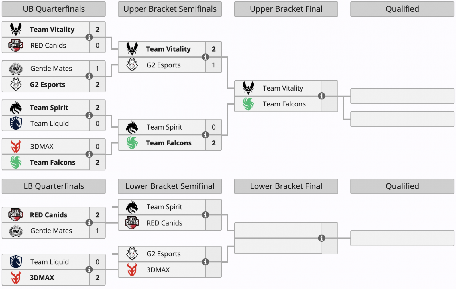 Кроме того, завершились стартовые матчи нижней сетки группы A, по итогам которых проигравшие команды лишились возможности продолжить выступление на чемпионате. RED Canids взяла верх над Gentle Mates, а 3DMAX расправилась с Liquid.