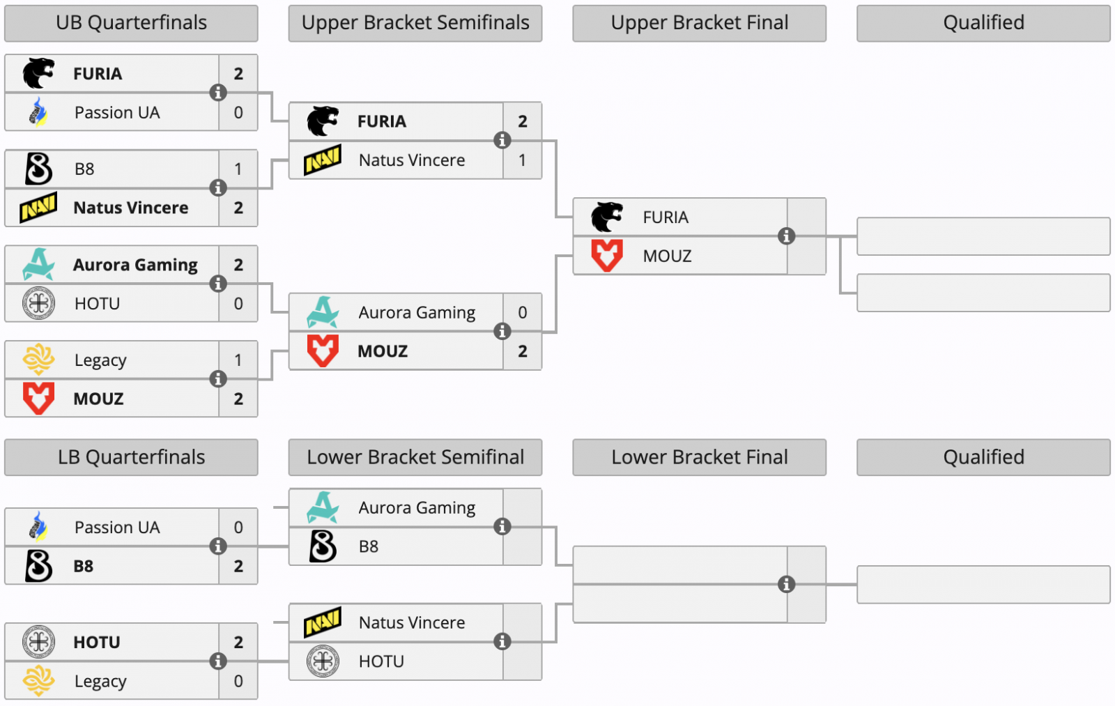Кроме того, завершились стартовые матчи нижней сетки группы B, по итогам которых еще две команды вылетели из чемпионата. Passion UA уступила B8, а Legacy потерпела поражение от HOTU.