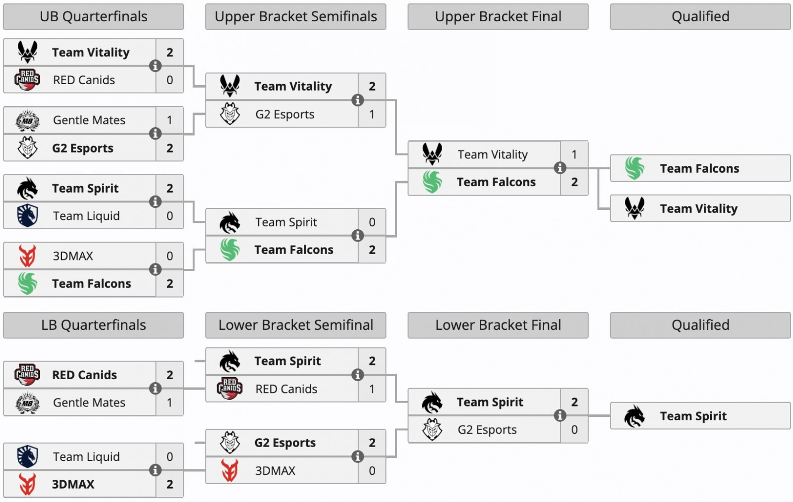 В финале верхней сетки Falcons со счетом 2:1 обыграла состав Vitality и тем самым гарантировала себе путевку в топ-4 ивента. Vitality, в свою очередь, начнет свое выступление в плей-офф с четвертьфинала.