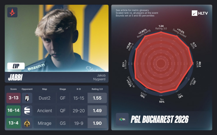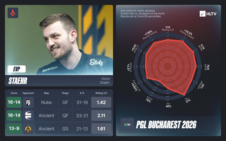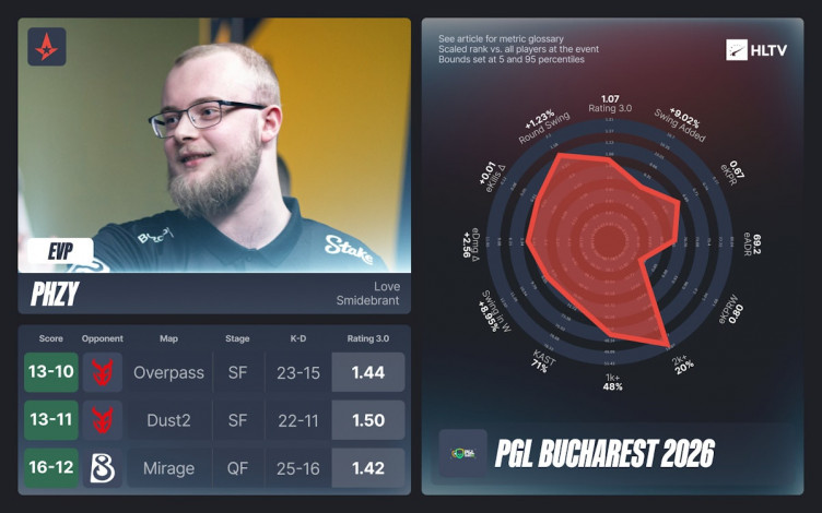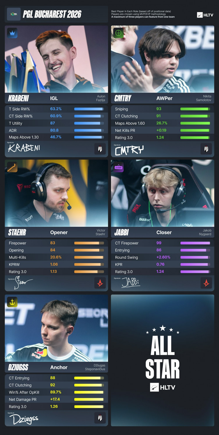 Кроме того, авторы HLTV представили символическую сборную лучших игроков PGL Bucharest 2026 на каждой роли – в нее вошли два представителя Astralis и три игрока FUT.