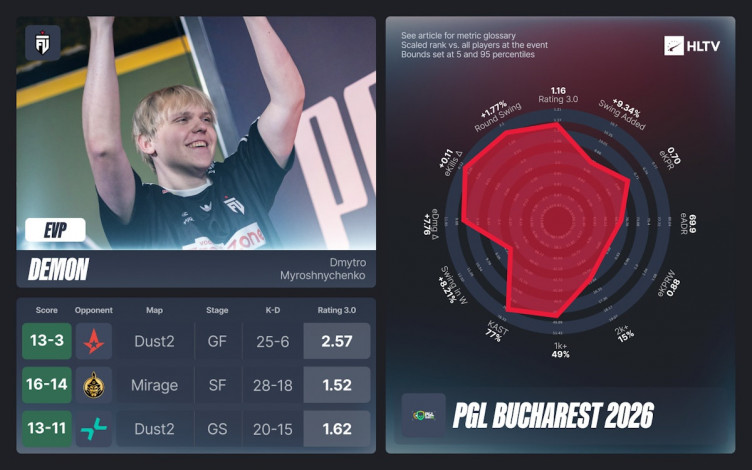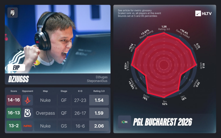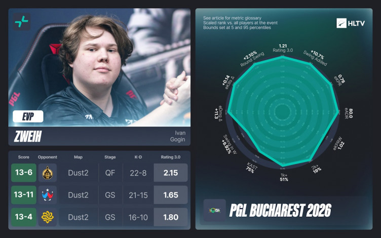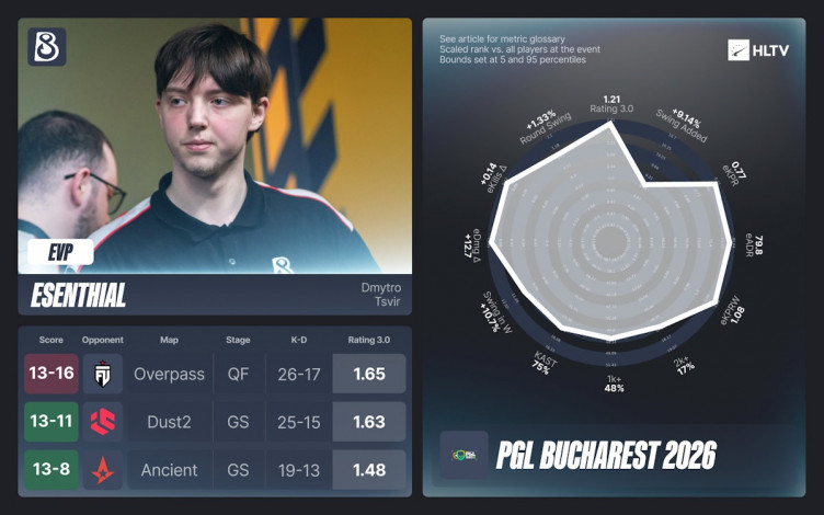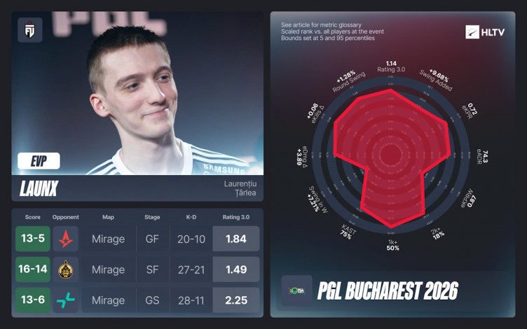 Портал HLTV.org опубликовал список киберспортсменов, удостоенных звания исключительно ценных игроков (EVP) по итогам минувшего чемпионата PGL Bucharest 2026 в Румынии.