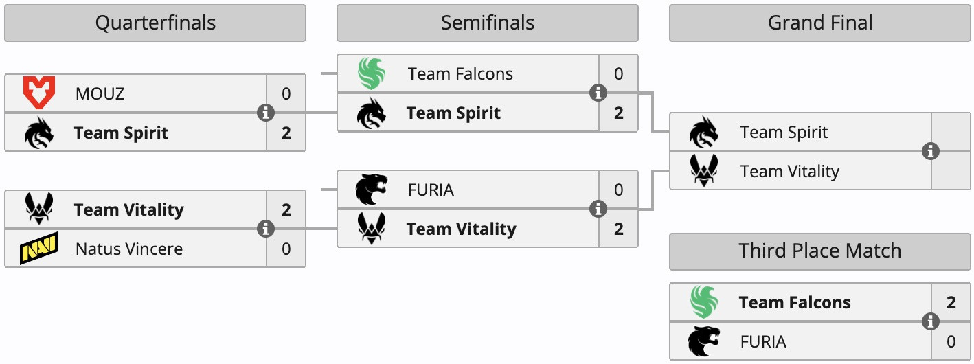 Таким образом, kyxsan и его тиммейты заработали $30 тыс. призовых, а выигрыш FURIA за четвертое место составил $20 тыс. Напомним, что в полуфинале турнира FURIA уступила Vitality, а Falcons не справилась с Team Spirit.
