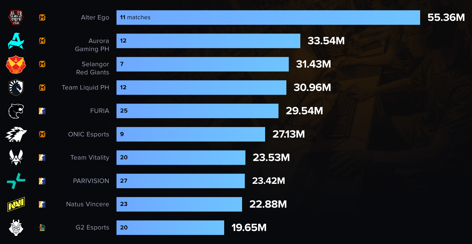 Второе место по этому показателю занял состав Vitality (23.5 млн часов просмотра), а замкнула тройку лидеров PARIVISION (23.4 млн). Следом за ними расположилась команда NAVI (22.8 млн). Статистику предоставил аналитический портал Esports Charts.